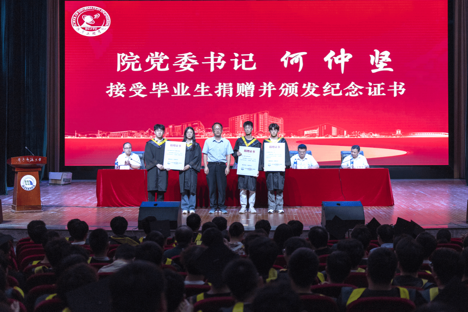 何仲坚代表学院接受毕业生捐赠并颁发捐赠证书,对参与捐赠的同学们感恩回馈学院的事业表示感谢,鼓励毕业生们在时代的浪潮中树立远大理想,脚踏实地,成就更卓越的自我。官雪辉宣读《关于表彰信息工程学院2024届“优秀毕业生”的决定》,罗晖为优秀毕业生颁发证书。