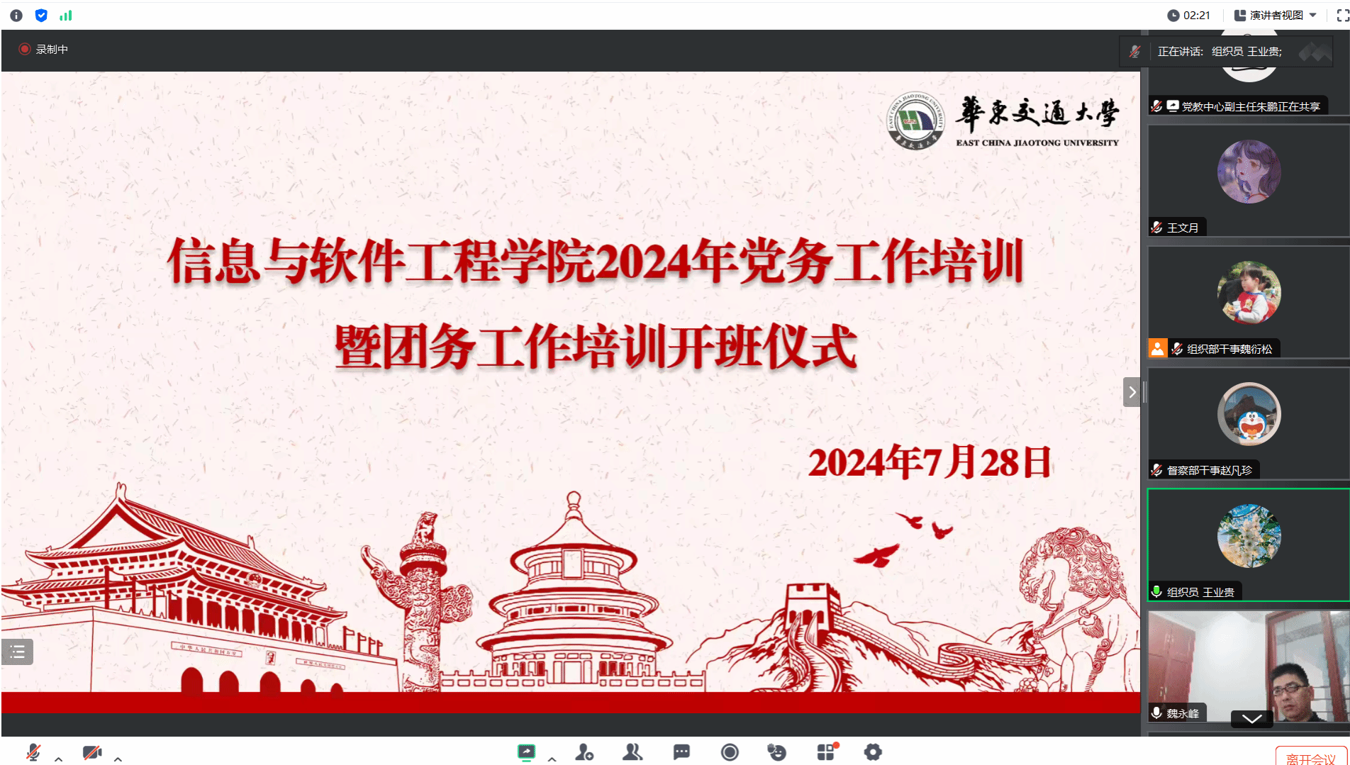 魏永峰对参训学员提出具体要求:一是带着感情学,强化政治属性。要充满深情、激发感情、满怀豪情,在党言党、在党忧党、在党为党,始终把党放在心中最高位置,牢记自己的第一身份是共产党员,始终同党中央在思想上政治上行动上保持高度一致,做政治上的明白人。二是带着责任学,增强宗旨意识。作为大学生队伍中高素质、年轻活跃的中坚力量,不仅要在学业上追求卓越,在社会实践、志愿服务、科技创新等各个领域也要积极作为;要以“全国向上向善好青年”欧阳自立、奋勇救人“江西好人”何江涛等学长为榜样,牢固树立全心全意为人民服务的宗旨意识,用实际行动诠释新时代青年的责任与担当。三是带着敬畏学,争做守纪表率。要服从培训管理,严格要求自己,自觉用规章制度来约束和规范自己的行为,养成良好的遵规守纪习惯,真正做到集中精力学习充电、静下心来激荡灵魂。
