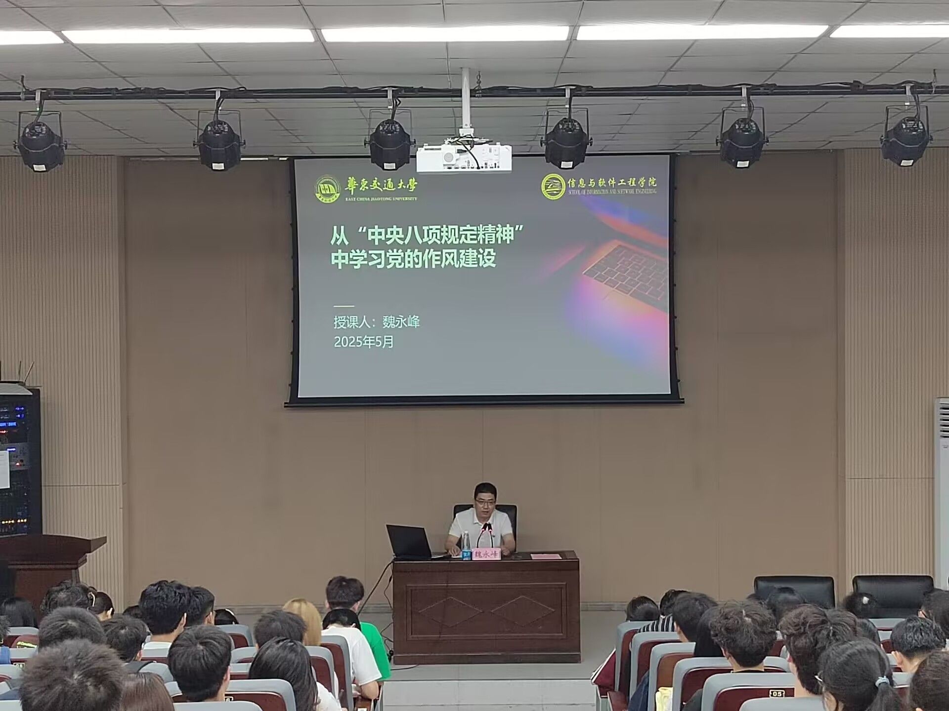授课中,魏永峰书记结合党史脉络与典型案例,系统阐释了中央八项规定的出台背景、主要内容、成效与经验,以及学生党员如何贯彻落实中央八项规定精神。他强调,中央八项规定不仅是作风建设的“铁规矩”,更是共产党人永葆初心的“试金石”,并号召大家将中央八项规定精神内化于心、外化于行,以“永远在路上”的坚韧执着,把规定要求转化为“以上率下”的行动自觉,将“严”的主基调贯穿到工作生活的每个细节,用党员干部的“一身正气”凝聚群众信任,以作风建设的“清新之风”护航高质量发展新征程!