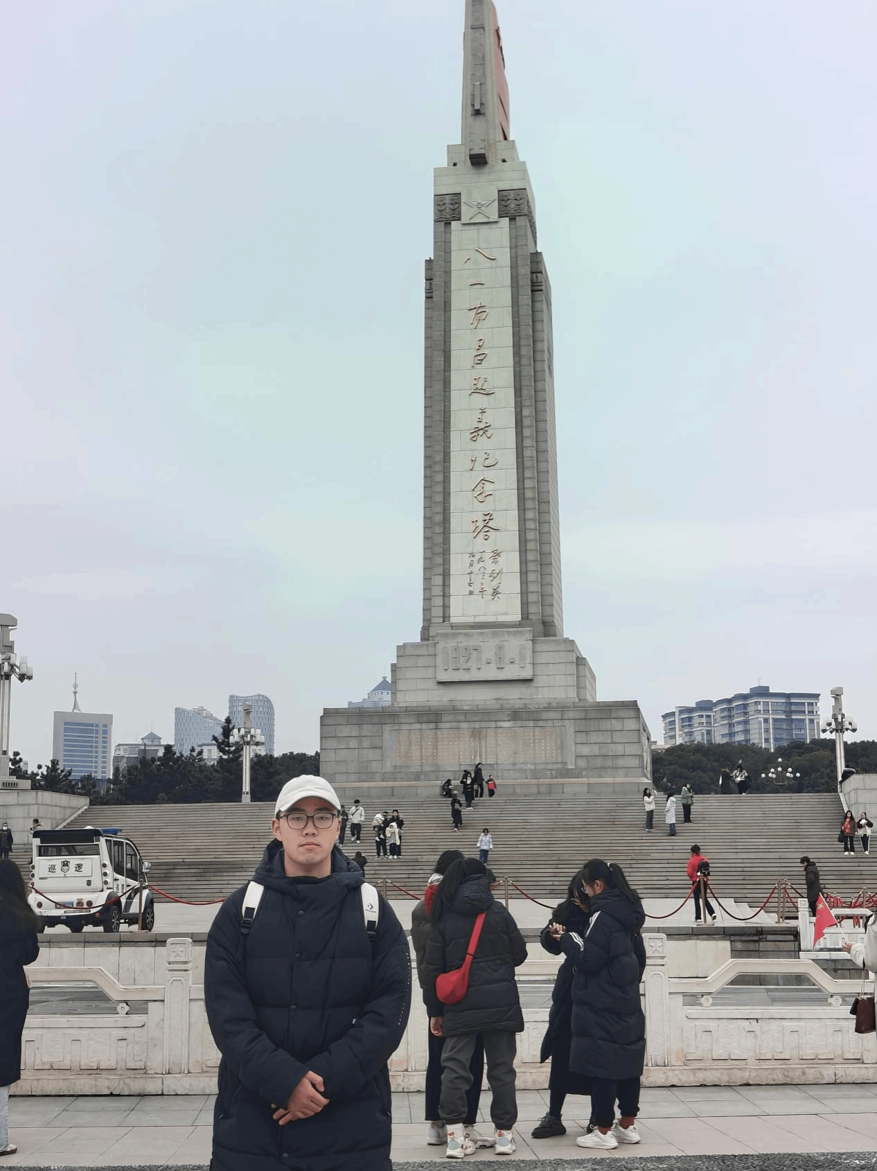 支部黄成浩同志来到八一广场,八一广场是南昌市的地标之一。广场占地面积7.8万平方米,是江西省最大的城市中心广场。广场的命名源于1927年的八一南昌起义,而广场中心矗立的八一南昌起义纪念塔,是由叶剑英元帅题写,塔身高耸入云,象征着起义战士们的崇高精神。广场还包括南端的追忆区、以8块浮雕为载体的怀念区和北端的市民休闲区等四大功能区,每一处都充满了历史的厚重感和人文的温度。