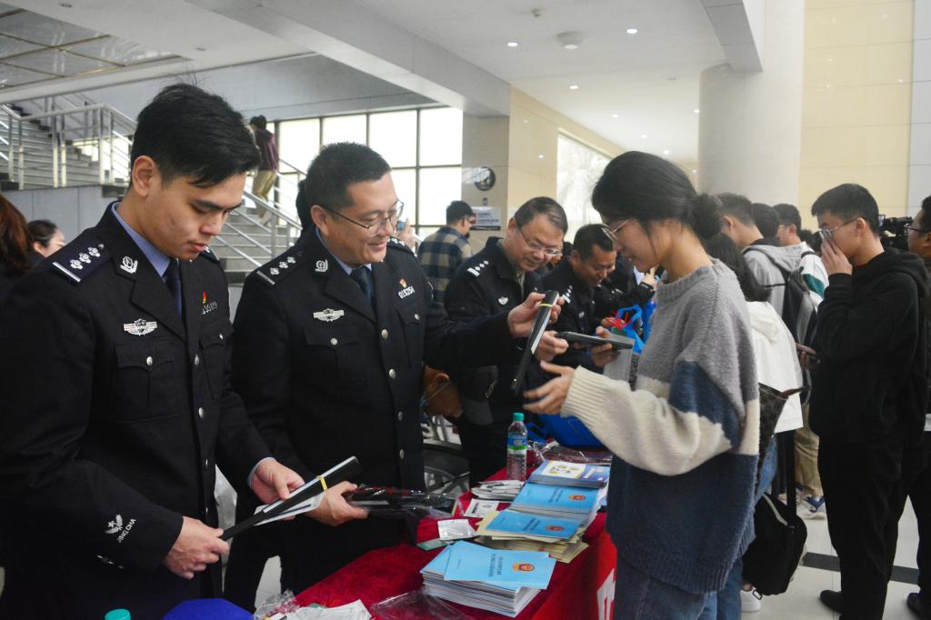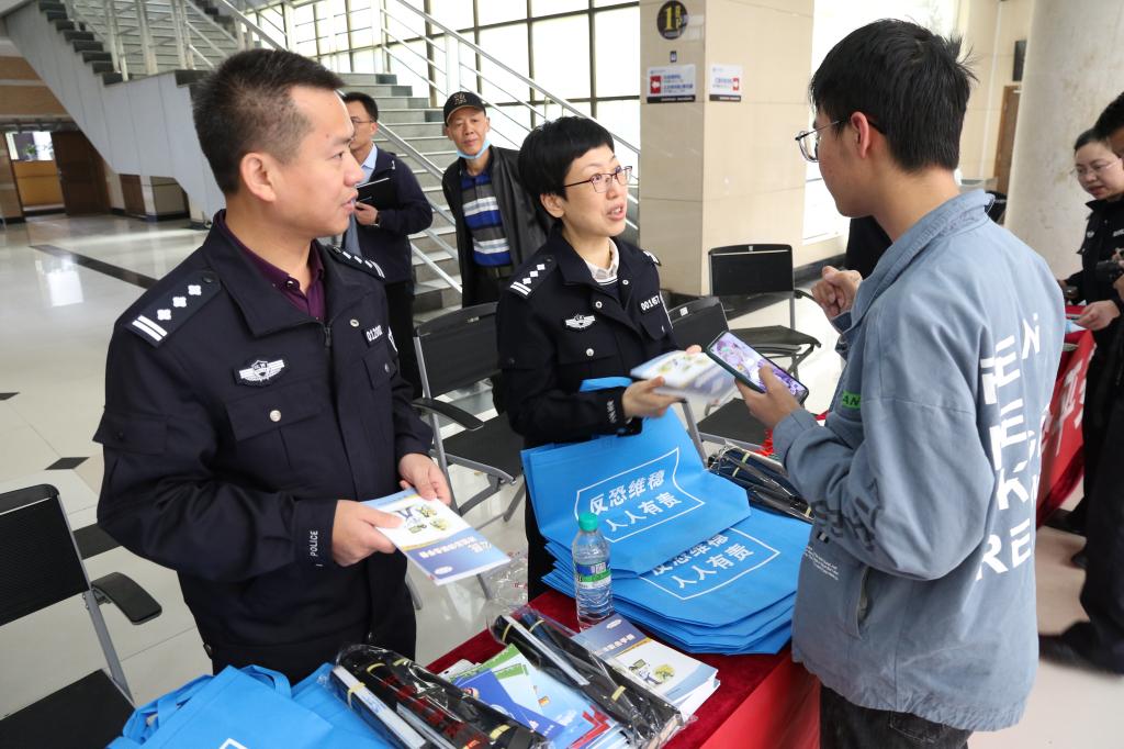 反恐怖小组工作人员就反恐知识向广大师生做了科普,详细介绍了,什么是恐怖主义、什么是恐怖活动、恐怖主义与宗教关系、谁是最高反恐机构以及重点防范机构有哪些。现场播放反恐宣传片,巩固反恐知识。与此同时,工作人员还为参与互动环节的同学赠送了防恐知识手册、折扇等纪念品。