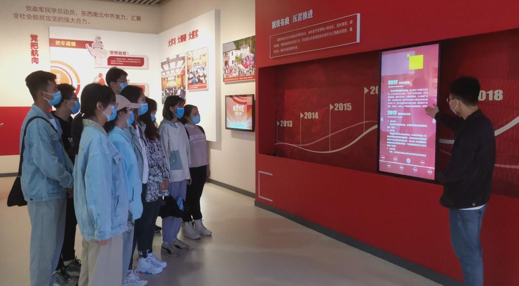 在观展过程中,同学们认真聆听解说员详细地讲解,并相互交流。一本本细致的扶贫笔记、一封封温情的家书、一串串鲜明的对比数字、一件件感人的事迹、一张张幸福的笑脸……每到一处,大家都感动不已,或驻足观看,或交流心声。每一个扶贫英模的先进事迹无不让同学们涤荡心尘,坚守信仰,继而激发向上向善的内在力量,每一位同学都在用心感悟脱贫攻坚奏响的幸福乐章,展览现场成了党史学习教育的“大课堂”。
