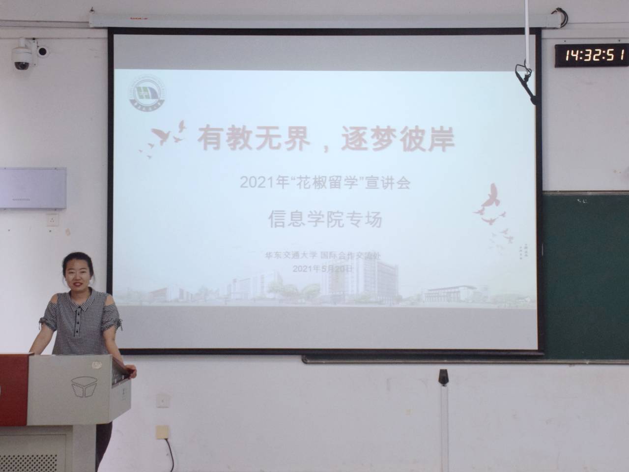 为了给我院学生提供更多就业选择,开阔国际视野,普及留学知识,5月20日,信息学院在逸夫楼111教室举办留学宣讲会。本次宣讲会由我校姚凯利老师主讲,学院19级和20级全体班委参加会议。