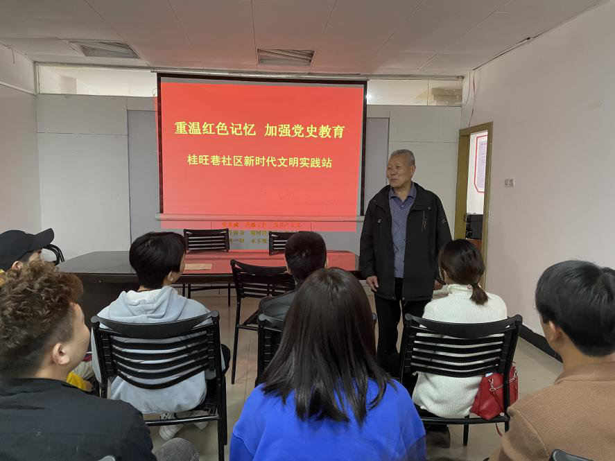 支部同志来到桂旺巷社区党员工作站,一位党龄55年的老党员带来了一场别开生面且印象深刻的党课。他谈到:“我曾经是一名工程兵,当时就是想着,无论情况多么危险,我都要冲在前面,入党动机很单纯。现在作为青年大学生的你们,要坚守自己的初心,坚持中国共产党的领导,对党忠诚,把坚定的理想信念落实到实际行动中”。