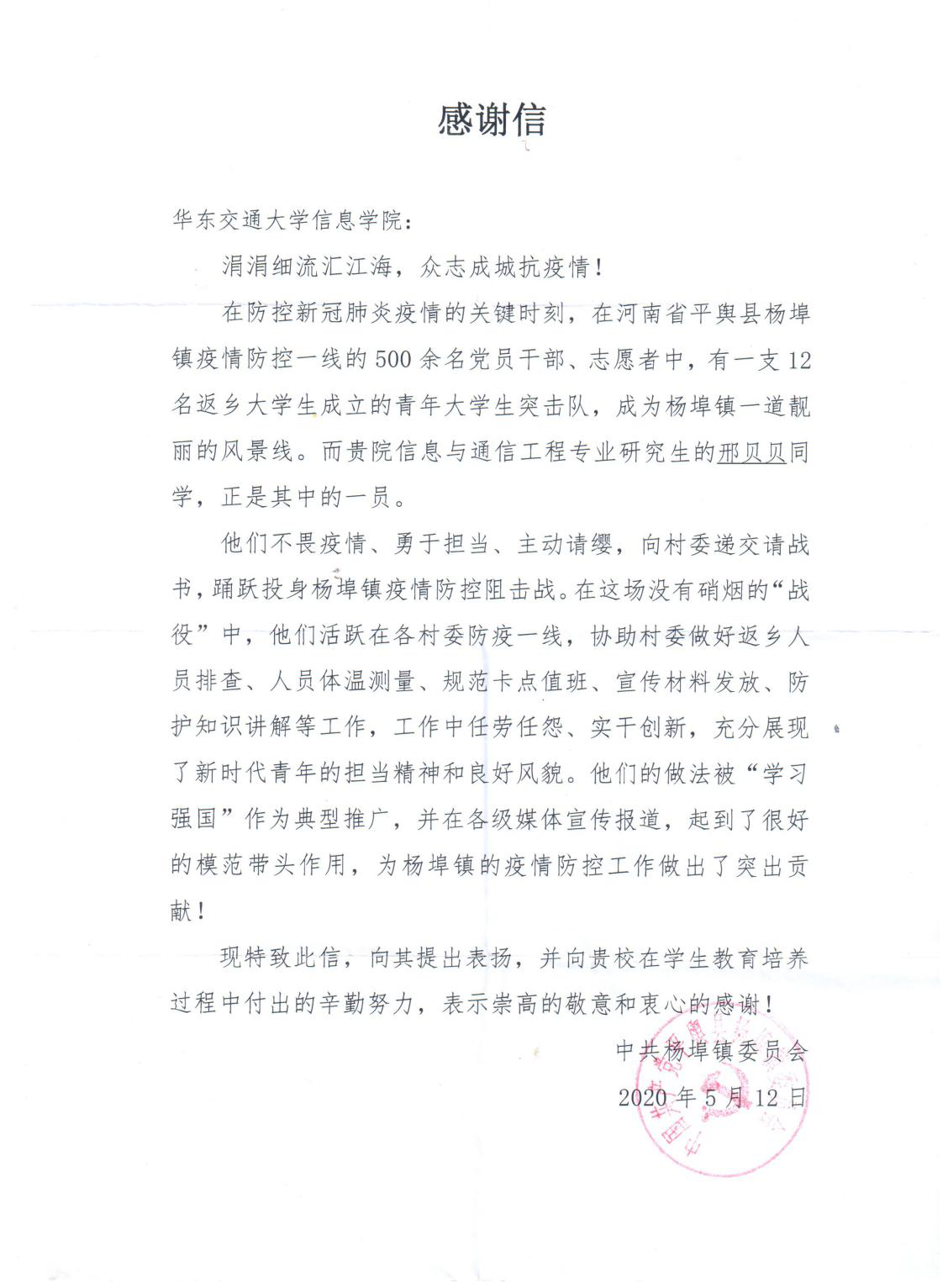 信息学院收到感谢信