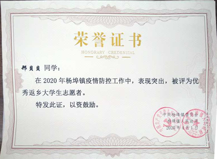 授予邢贝贝的荣誉证书