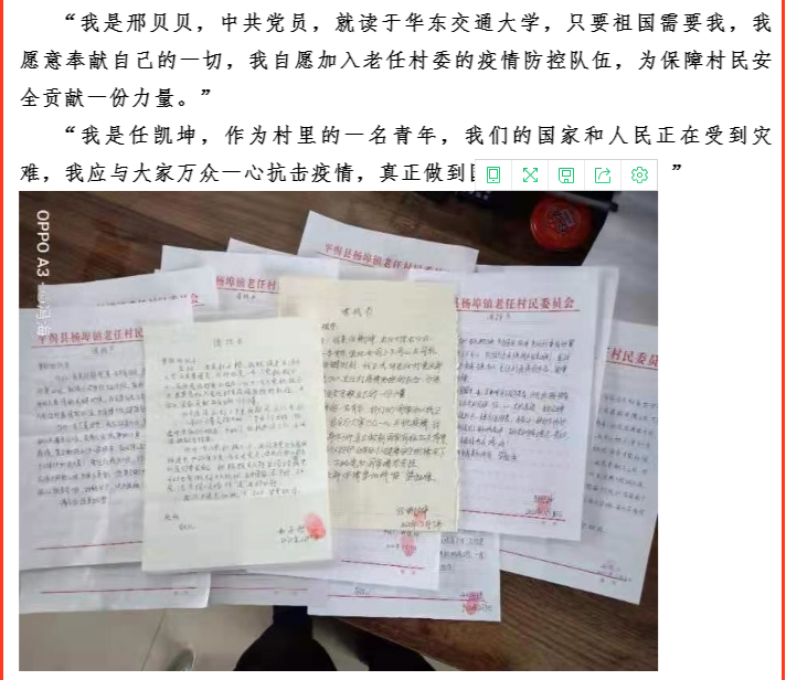 要防止疫情进一步扩散,必须向广大群众讲清楚疫情的严重性、防控的紧迫性、群众自我防范的必要性。因此邢贝贝同学就是做的这一宣传工作,她说:“将国家、省市县镇发布的疫情信息和疫情防控常识宣传到位,提高村民们重视疫情、防控疫情的意识,这对于农村的防控非常重要。做好这一环节,就可以很好的对农村的疫情进行防控。”