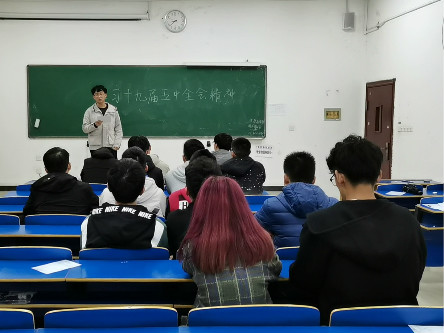 团支书李子涵指出,作为党的后备军,青年大学生应坚持走中国特色社会主义道路,坚持以习近平同志为核心的党中央领导,不忘初心,砥砺前行,与各族人民开创创新,奋进有为,推进国家各项事业发展。他对班级同学提出以下建议:一、乘势而上,在深刻认识历史方向和发展大势中定好自己的位;二、坚定自信,在不断增强政治定力和战略定力中走好自己的路;三、担当实干,在正确把握奋斗目标和发展举措中办好自己的事。