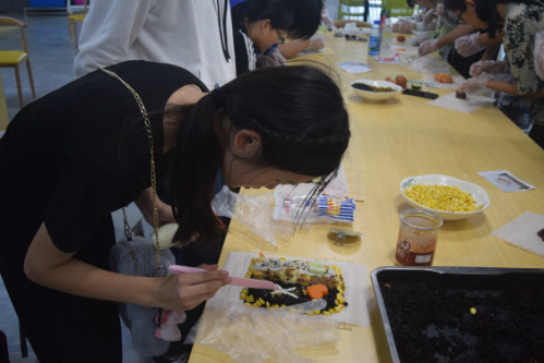 在“粮”工巧匠环节里,参与者们积极参与,工作人员准备好煮熟的食材后,用糯米、黑米、红豆等食材摆出,教导、协助参与者摆放图案。同学们以小组为单位开始食物创意摆放,学生热情高涨,摆放出熊猫、“70”等各式图样的图案。活动吸引不少食堂工作人员围观,活动结束后,同学们互相分享并食用劳动成果。