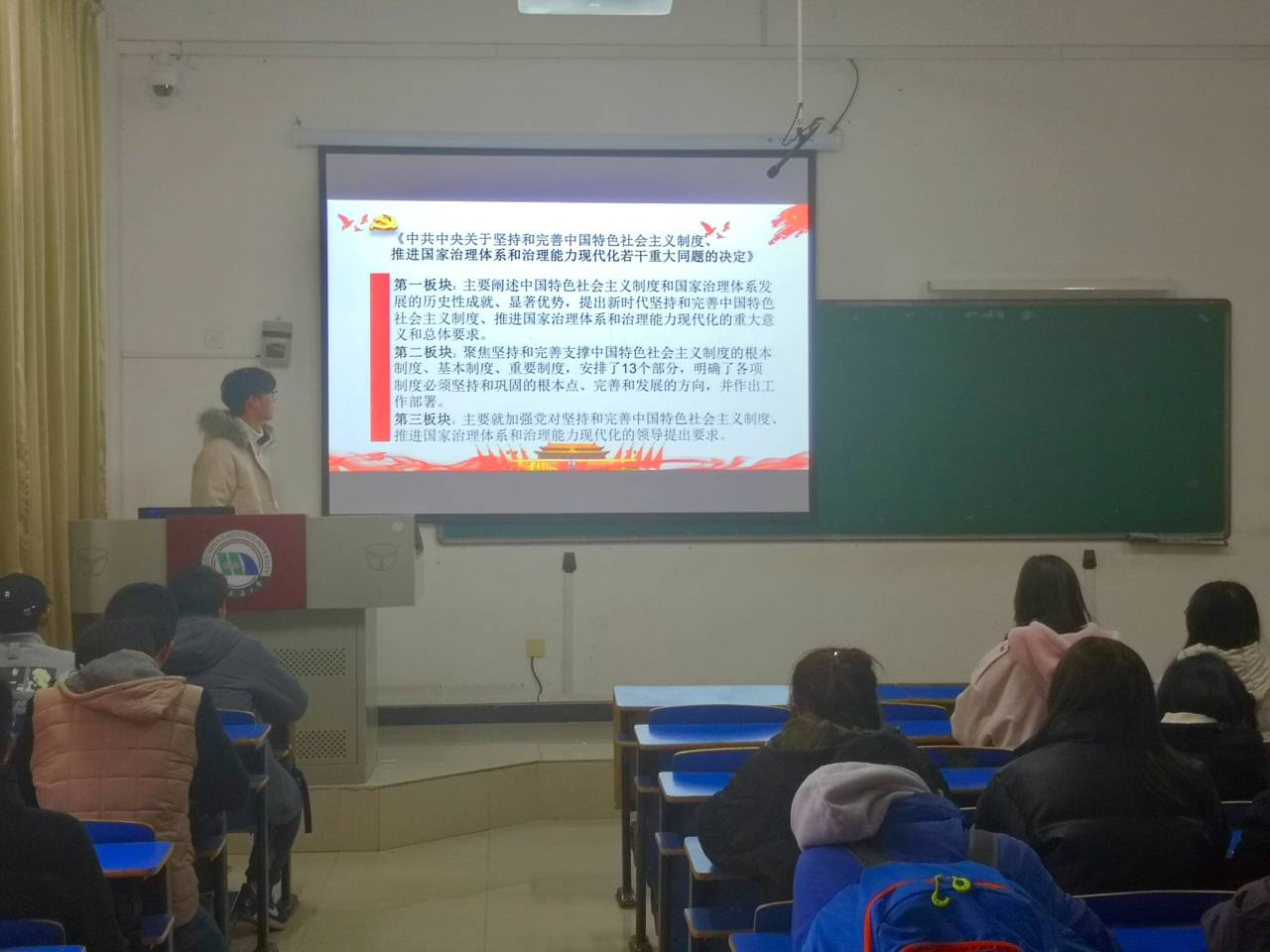 11月29日下午,通信工程2017-1、2班在14栋103共同组织召开了2019年度第三次班级研讨会议,两个班级全体成员参加了本次会议。会议主要议程是传达和集中学习十九届四中全会《公报》和《中共中央关于坚持和完善中国特色社会主义制度、推进国家治理体系和治理能力现代化若干重大问题的决定》。17通信二班团支书张天昊主持会议。