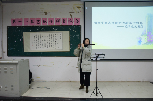 在颁奖过程中,还穿插了许多美妙的艺术表演。校舞蹈协会的成员们给观众带来了一场火热的开场舞《Boom Clap》,活跃现场气氛。信息学院尹天骄同学倾情演奏笛子独奏《浮生未歇》。悠扬细润的笛音将观众引入一种平静祥和的意境,让人浮想连连。