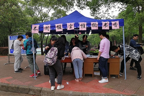 校内摆摊时行人纷纷驻足,观看宣传标语,在书签上写下名言佳句并挂在宣传处。“给岁月以文明,而不是给文明以岁月”、“归根结底也不过是一种转瞬即逝的现实”……随风摆动的书签吸引了更多同学来了解世界读书日,一句句甄选的美文也为同学们推荐了更多优秀的精神食粮。