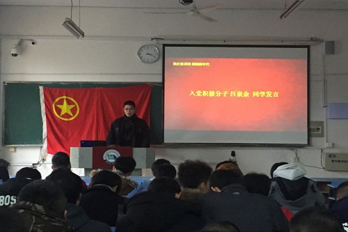 会议伊始,团支书带领同学们学习了新华社长篇通讯《习近平:新时代的领路人》,并引申到人民日报关于学习贯彻党的十九大精神系列评论员文章,重点学习了十九大关于“勿忘初心,方得始终”的思想内容。会上,同学们一同观看了《辉煌中国》纪录片。“一项项‘超级工程’见证着祖国的日益强大、人民生活水平的日益提高,民族自豪感也油然而生,厉害了,我的国!”团支书王嘉伟说道。