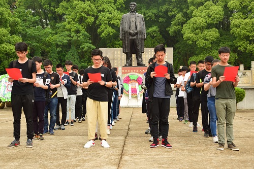 红色基因从哪里来,红色基因是什么,红色基因将到哪里去?带着这三个疑惑,同学们赴方志敏烈士陵园,瞻仰革命先烈,寻觅红色基因。全体同学深色着装,神态凝重。大家怀着敬畏的心情登上阶梯,来到烈士墓前,肃立默哀,以表哀思。