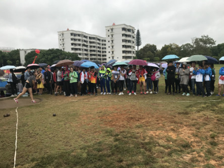 恶劣的天气也阻挡不了健儿们向上进取的脚步。随着裁判手中红旗的落下,只见杨娜娜将右脚移至投置圈中心部位,腰部发力,右手顺势将铅球推出,一气呵成,而铅球亦在空中划出了一条惊人的抛物线。没有太大的落地声,却有一片热烈的掌声。杨娜娜的三次掷球都堪称完美,并摘得全校第六名的佳绩。