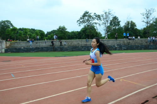“砰——”,枪声与欢呼声同时响起。早在预赛中突破校级记录的2535号刘雪梅一出场便点燃全场。伴着“刘雪梅!加油!”的助威声,只见她一马当先地“领跑”在前,不断拉大与其他选手的距离。100米、80米、50米......刘雪梅丝毫没有放缓脚步,咬紧牙关进行着最后的百米冲刺。呼气、探身、过线,时间定格在2分38秒09,全场沸腾。