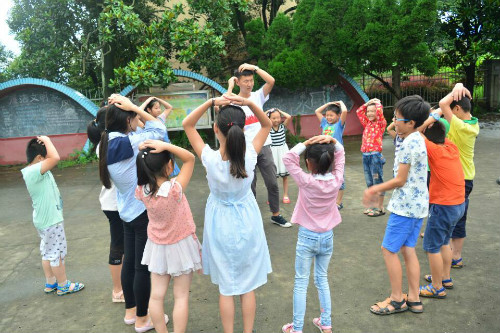 志愿者们在教小朋友做游戏
