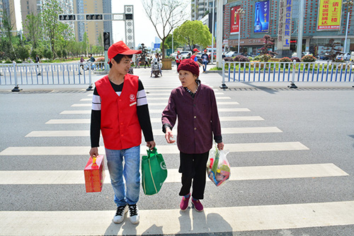 “奶奶,需要我帮你提一下东西吗?”在川流不息的交通路口,一位老奶奶正吃力地提着菜篮子缓慢的走着,站立在道路旁的志愿者立刻上前帮助老奶奶提起了沉重的菜篮子。由于路口的交通信号灯已经损坏,时常有过往的车辆不顾斑马线飞驰而过,短短的一段路充满了危险,见此,志愿者们主动为老奶奶“保驾护航”,在斑马线上依次打出“停车”的手势,过往的车辆纷纷在斑马线前停车让行,一条由志愿者组成的“红色斑马线”成为了喧嚣路口的一道亮丽的风景线,老奶奶的脸上溢满了笑容。