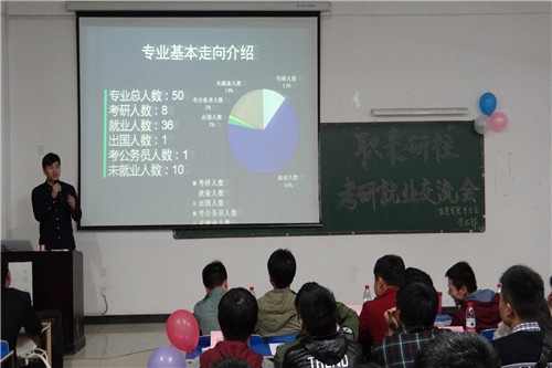 为减少和避免低年级同学在考研和就业方面的盲目性,激发同学们的学习与考研热情,4月24日,由学生会学术部承办的“职来研往”考研就业交流会于教14栋212室召开。资深考研分析师廖保老师、12级信息2班孟帅、12级计算机1班孙兴作为主讲嘉宾应邀出席本次交流会。
