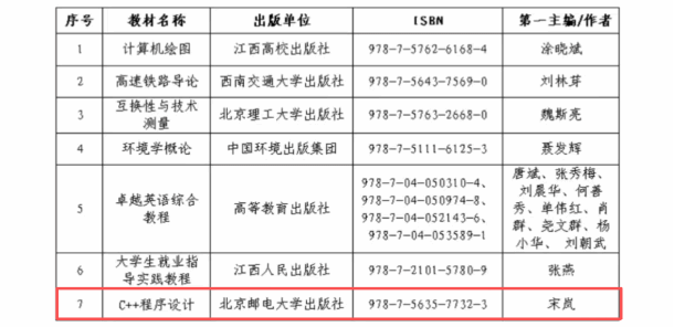 近日,江西省教育厅发布《关于公布江西省普通高等教育本科省级规划教材入选名单的通知》(赣教高字[2026]7号),信工学院宋岚老师主编的《C++程序设计》成功入选第二批江西省“十四五”普通高等教育本科省级规划教材。