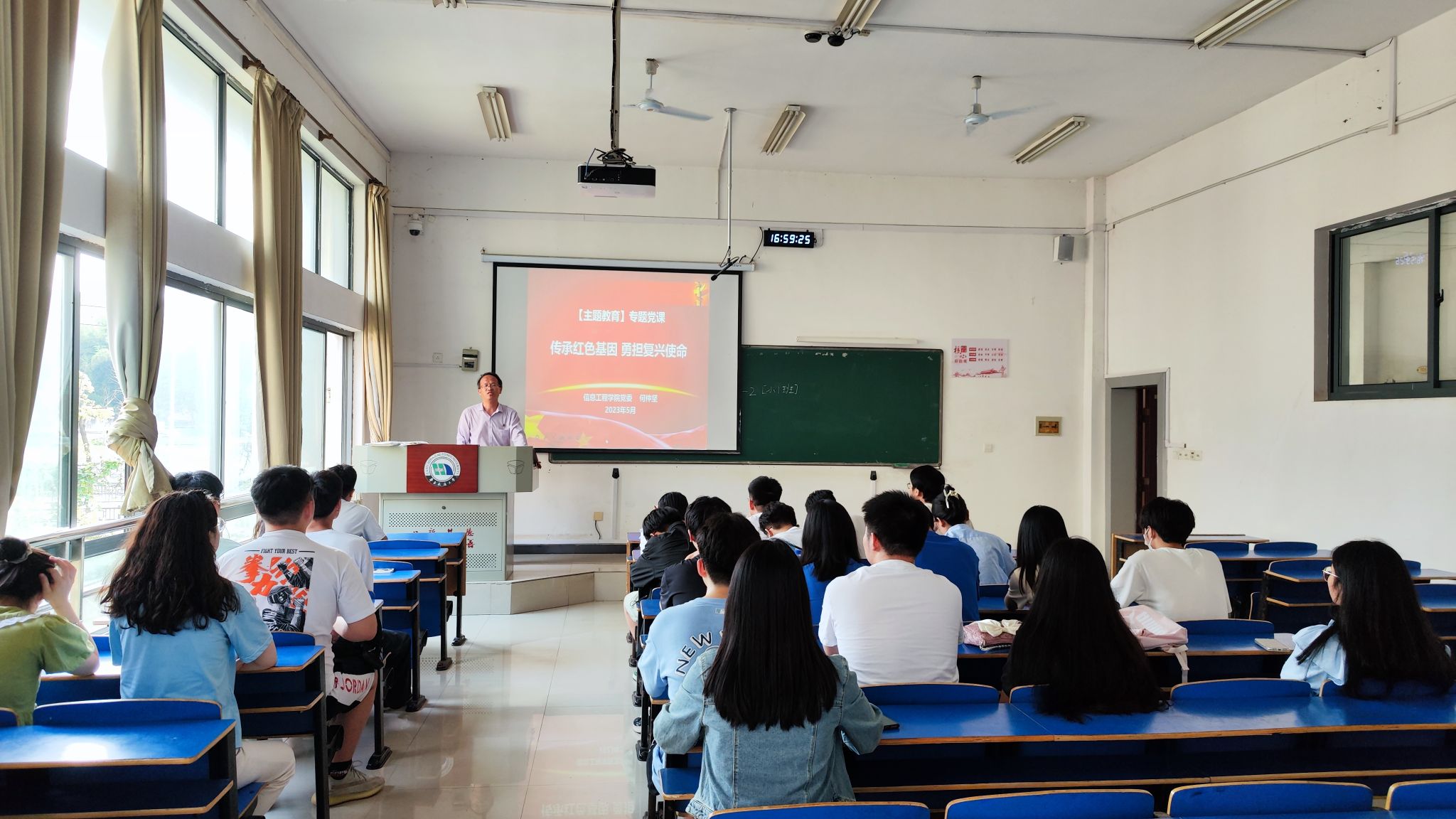 为深入学习贯彻习近平新时代中国特色社会主义思想,推动青年学生党员坚定理想信念和担当作为,5月26日下午,信息工程学院党委书记何仲坚为物联网工程与信息工程学生党支部及创新基地学生党支部上了一堂生动的专题党课,主题为“传承红色基因,勇担复兴使命”。物联网工程与信息工程学生党支部书记洪亚聪主持会议。