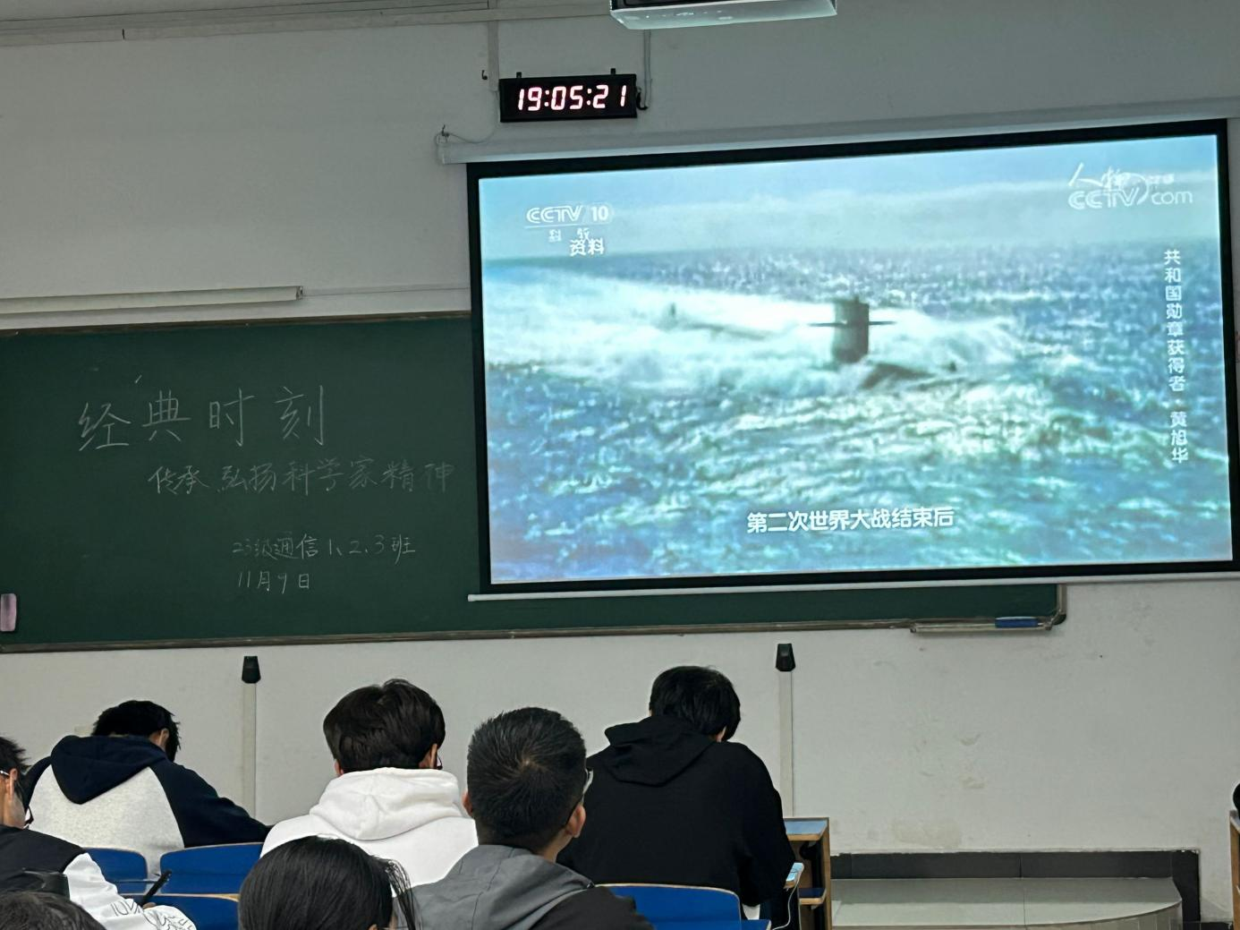 为加强青年思想教育,信息学院2023级通信工程1、2、3班于11月9日在逸夫楼411室开展了第五次“经典时刻”活动,观看《人物·故事》第一期节目《共和国勋章获得者·黄旭华》。