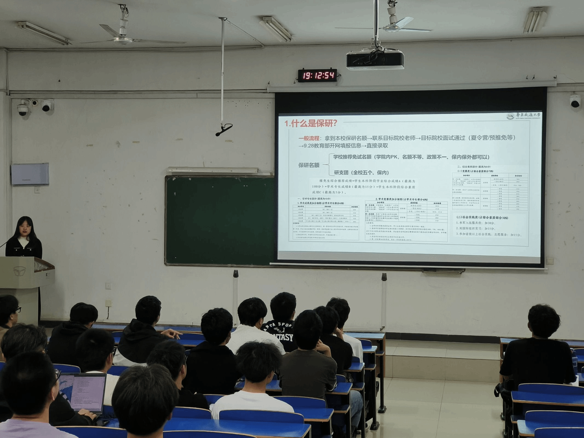 本次分享会上,雷子怡围绕保研、科创比赛、实验室等四个方面进行介绍。雷子怡就保研的流程、保研名额、保研要求以及夏令营、预推免、九推的区别等为23级人工智能的同学们做了详细地解说。