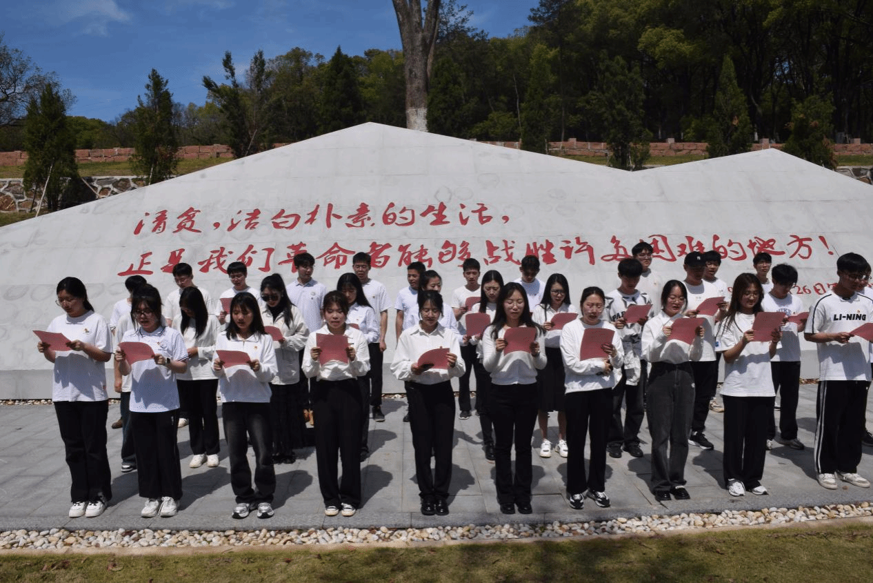 同学们到达方志敏烈士纪念园后,有序来到纪念碑前。首先,同学们在烈士墓前肃立致敬,向纪念碑敬献花圈,全体师生在雕塑下重温入团入党誓词并共同举起右手庄严宣誓。铿锵有力的誓词进一步增强了团员党员们的历史责任感和民族使命感。随后,同学们用嘹亮的声音朗诵了《可爱的中国(节选)》,回望着先辈的足迹,聆听着先辈的教诲。最后,领导老师组织学生参观陈列室,集体讨论所想所感,抒发出了坚定的共产主义信念。活动在一片肃穆中顺利结束,随后师生安全返回学校。